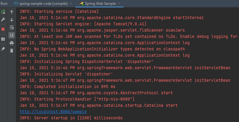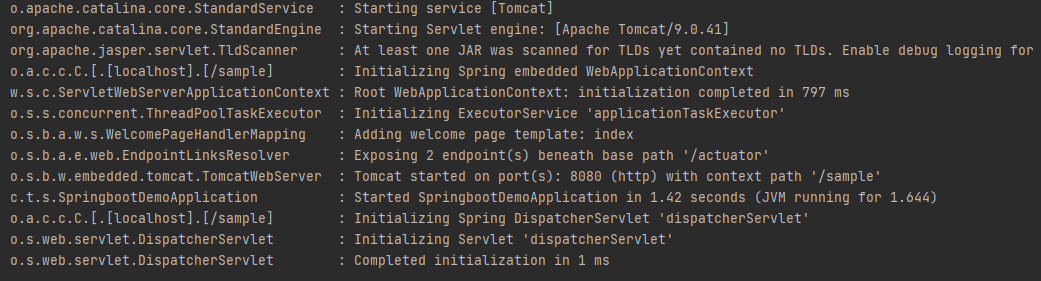 You will see the similar output that Spring Boot starts Tomcat, initializes DispatcherServlet and completes deployment of the application: